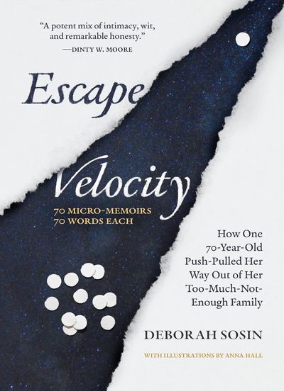In Escape Velocity, a genre-bending constellation of 70 micro-memoirs of 70 words each, Deborah Sosin unravels a story of family entanglement with her loving but overbearing parents. Too much intrusion. Not enough space. What one therapist later dubbed “a mirage of intimacy.” A feisty, perceptive girl, Sosin strains against her family’s gravitational pull in search of a separate self. While navigating the confusing terrain of 1970s feminism, she endures a near-rape, enters a fraught romance with a gay man, and makes a momentous choice about an unexpected pregnancy.