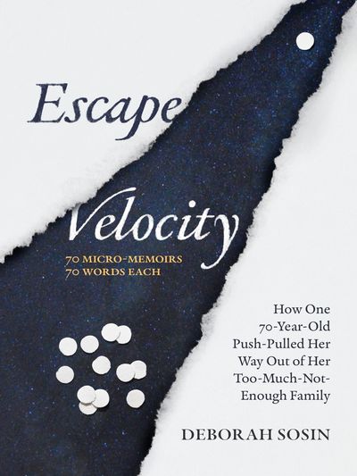 In Escape Velocity, a genre-bending constellation of 70 micro-memoirs of 70 words each, Deborah Sosin unravels a story of family entanglement with her loving but overbearing parents. Too much intrusion. Not enough space. What one therapist later dubbed “a mirage of intimacy.” A feisty, perceptive girl, Sosin strains against her family’s gravitational pull in search of a separate self. While navigating the confusing terrain of 1970s feminism, she endures a near-rape, enters a fraught romance with a gay man, and makes a momentous choice about an unexpected pregnancy.